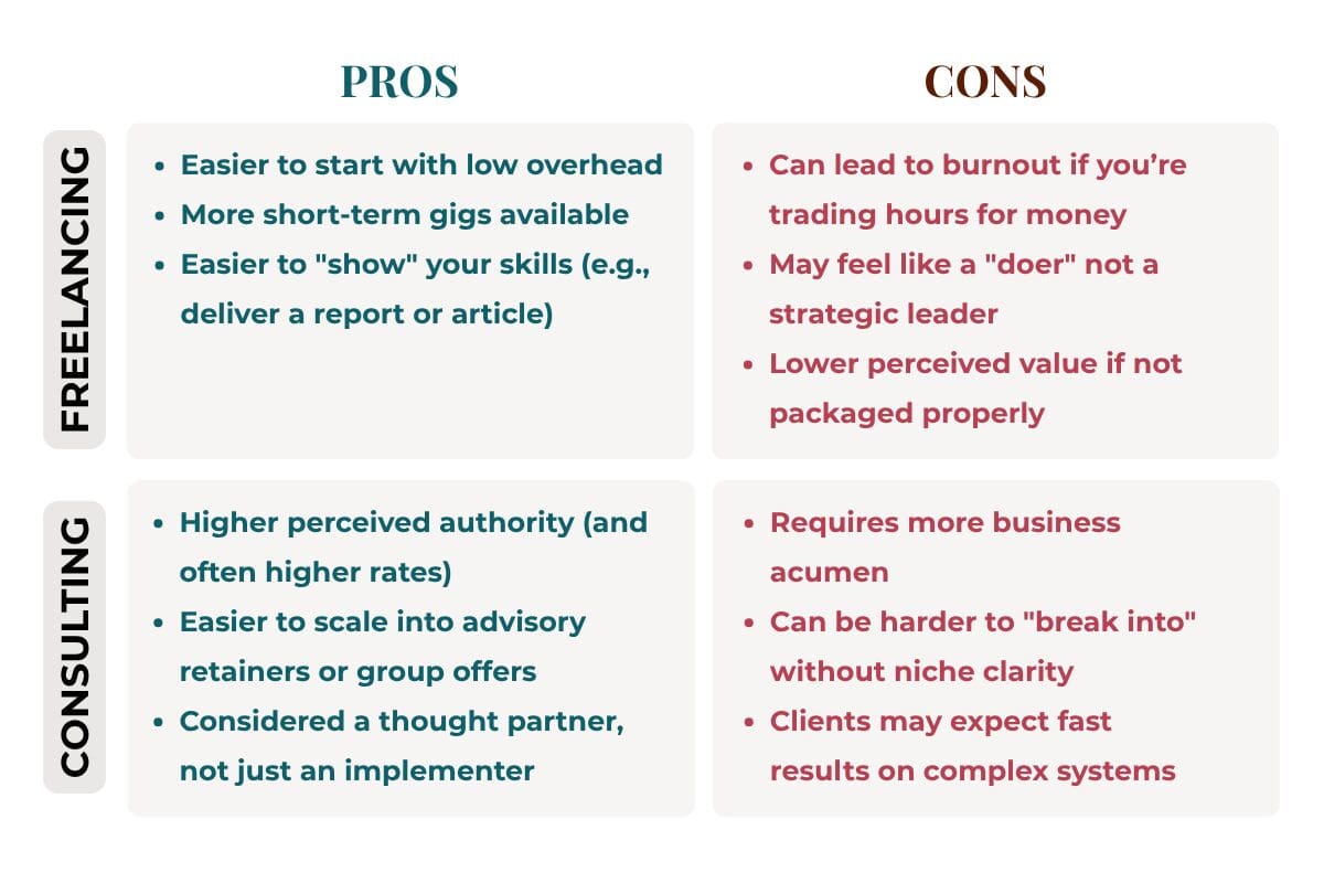 There’s no legal line between “freelancer” and “consultant” but your title, positioning, and confidence all influence how you show up (and how you’re compensated). Below are some pros and cons of each path.